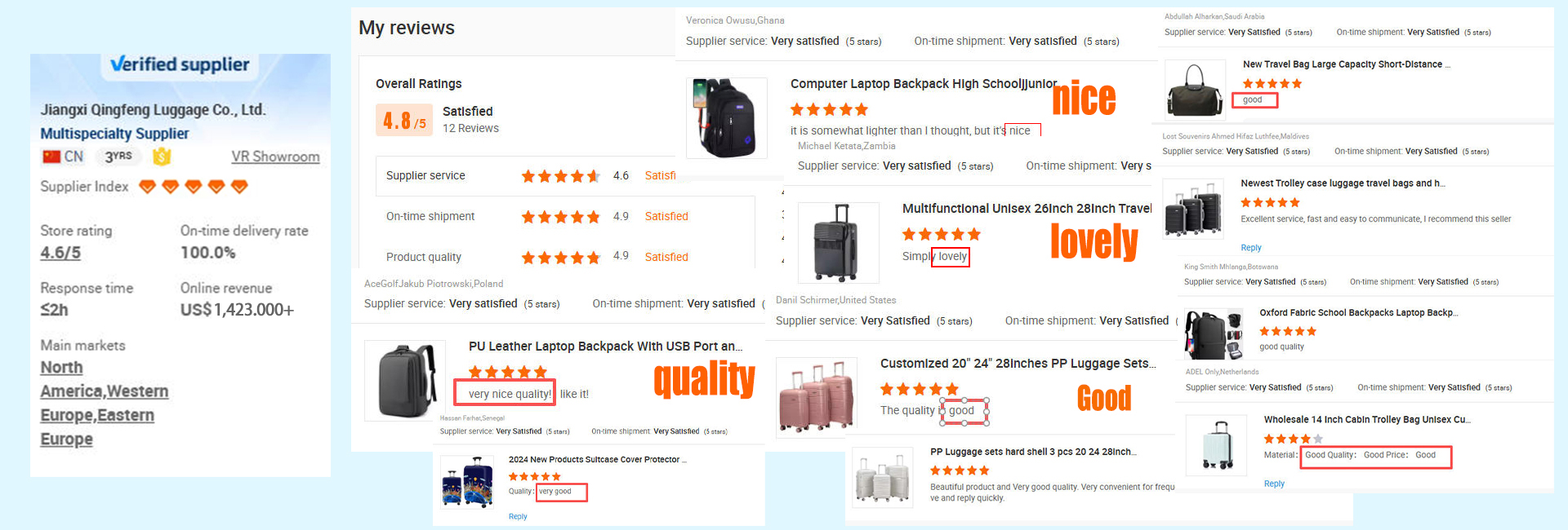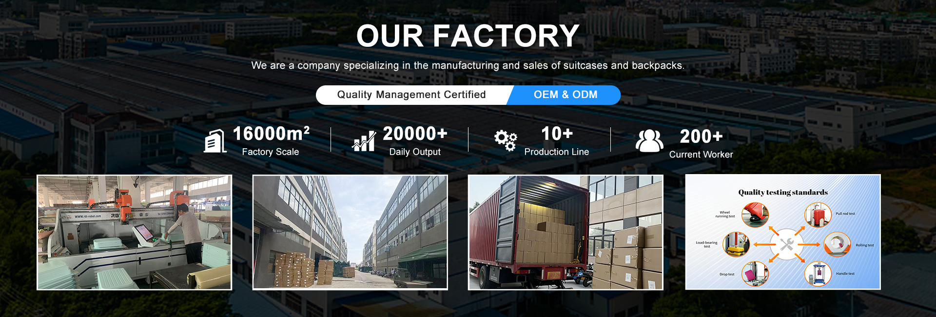 Jiangxi Qingfeng Gepäck Co., Ltd. hat mehrAls 10 Jahre Produktions erfahrung inGepäck industrie, wir spezial isierten uns auf Verkauf ABS, PP,PC, weiches Gepäck und alle Arten von Rucksäcken, stellen Sie zur VerfügungBeschaffungs dienstleistungen aus einer Hand, haben wirProfession elles Design-Team, QC-Team und hochEffizienz-Pre-Sales-und After-Sales-Service-Team,Bieten Sie wettbewerbs fähigen Preis und 12 Stunden effektiven ServiceUnterstützung für unsere Kunden.Unsere Fabrik umfasst eine Fläche von 16.000 Quadratmetern; wir haben3 Sätze Blech extrusion maschinen mit einer täglichen Produktions kapazitätVon 20.000 pcs, 10 Sätze Blister maschinen, 2 Sätze Schneide maschinen,Und 7 Produktions linien, mit einer täglichen Produktions kapazität von 8.000 pcs.Unser Unternehmen hält sich an den Ausgangs punkt, Kunden zu treffenAnforderungen an die Produkt qualität und das Prinzip der kontinuier lichen VerbesserungProdukt qualität, halten Sie sich an strenges Qualitäts managementStellen Sie stabile Produkt qualität, schnelle Liefer unterstützung zur Verfügung;Wir bieten alle Arten von OEM-und ODM-Dienstleistungen für unsere Kunden und hoffenDass wir durch unser Fachwissen und unsere unermüdlichen BemühungenBieten effiziente Produkt anpassung, angemessene Kosten und reduzieren nachVerkaufs kosten für aufstrebende Marken.