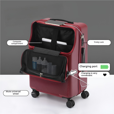 Stilvoller, hochwertiger offener Reisekoffer vorne mit USB-Anschluss und Handgepäck-Reisetasche-Trolley-Set